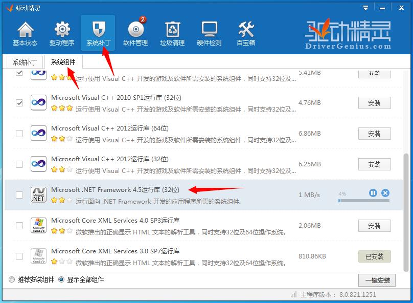 第二步:打开驱动精灵“系统补丁”中的“系统组件”一栏,安装提示您需要安装的.NET Framework组件(如下图)。
