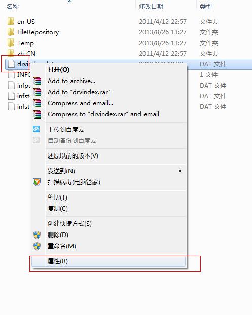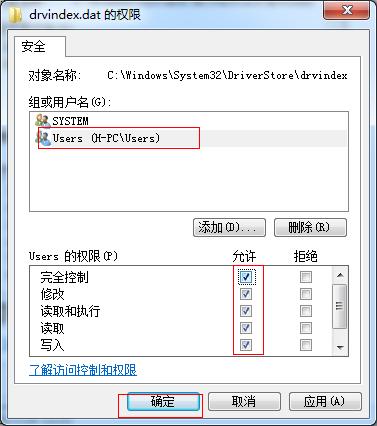 第四步:重启后进入C:\Windows\System32\DriverStore目录,分别使用如下方法设置drvindex.dat、 INFCACHE.1、infpub.dat、infstor.dat、infstrng.dat五个文件的权限(如下图)。