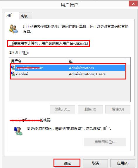 2、选中要使用的帐户名,并取消“要使用本计算机,用户必须输入用户名和密码”的勾选框;