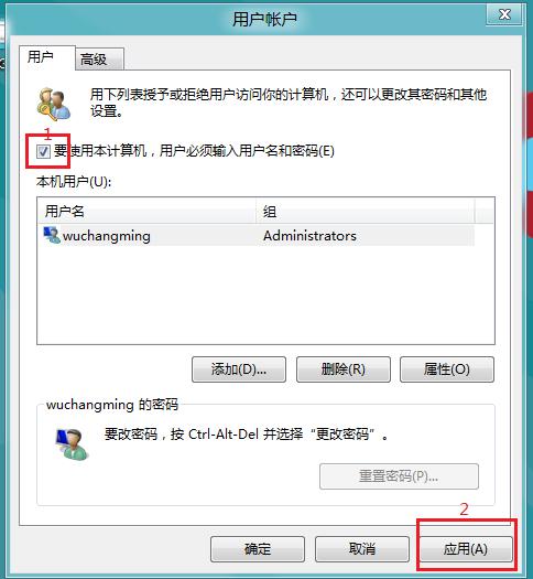 2、在出现的“用户帐户”设置窗口中,取消“要使用本机,用户必须输入用户名和密码”的选择,然后“应用”。在弹出的“自动登录”对话框中输入密码,确定。