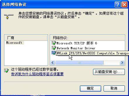 第3步,打开“选择网络协议”对话框,在“厂商”列表中选中Microsoft选项,在“网络协议”列表中选中NWLink IPX/SPX/NetBIOS选项,并单击“确定”按钮,如图所示。