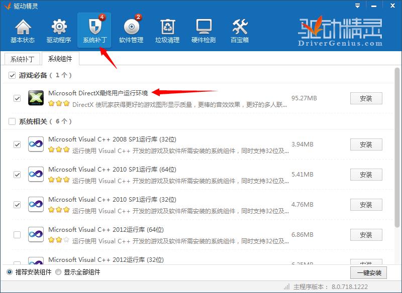 3、在驱动精灵“系统补丁”的“系统组件”一栏下安装“Microsoft DirectX终用户运行环境”。