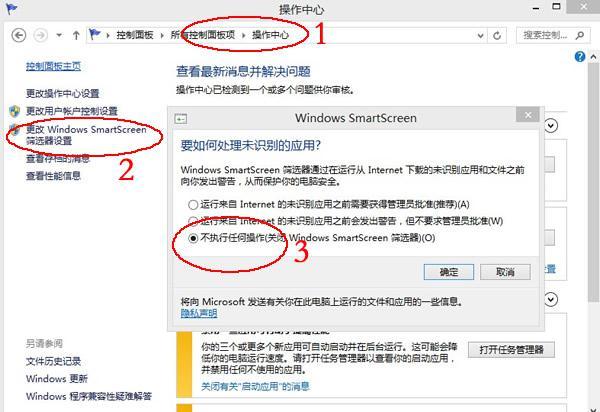 按Win+X组合键---控制面板---操作中心---更改Windows SmartScreen筛选器设置---不执行任何操作---确定。如下图: