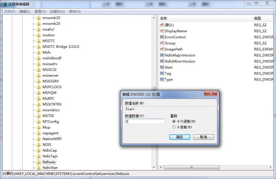 在一台正确配置的电脑,开始---运行---regedit---回车,找到[HKEY_LOCAL_MACHINE\SYSTEM\CurrentControlSet\Services\Ndisuio]导出注册表(这个从“文件”---“导出”里)注意看一下 Ndisuio 下面的 start 值改为2;