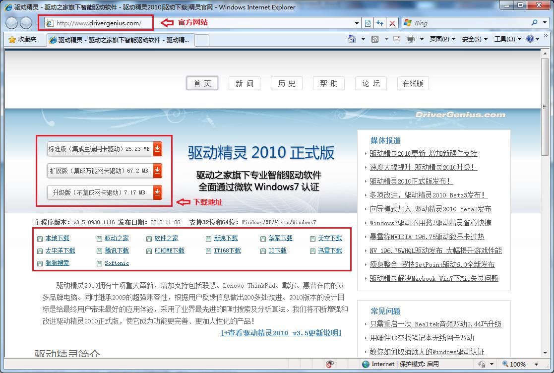 驱动精灵 2010版本支持32/64位Windows XP/Vista/7操作系统下的智能硬件检测及驱动程序升级功能。为了确保驱动精灵在线智能检测、升级功能可正常使用,您需要确认您的计算机具备正常的互联网连接能力。在非联网状态,驱动精灵部分功能将不可用。