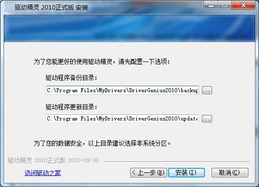 您可以自由选择驱动精灵的安装路径,也可以对驱动精灵的驱动备份、下载目录进行配置。我们建议您把备份和下载目录设置在非操作系统分区,这样在重新安装操作系统时可以保证驱动文件不会丢失。