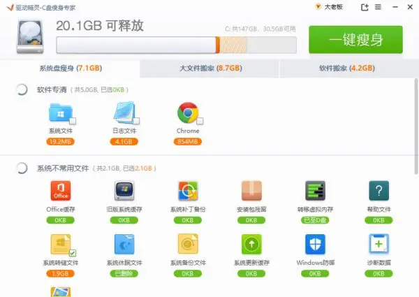 专业C盘清理功能,提供系统盘瘦身、大文件搬家、软件搬家等功能,根据文件类型、体积大小、日期等快速筛选,高效安全的完成C盘清理工作。