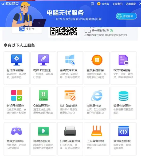 付费服务,主要针对付费会员,提供驱动安装、修复、更新、卸载;系统修复、重装;弹窗清除、浏览器修复、数据恢复等。