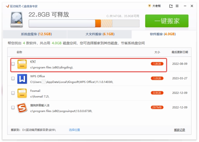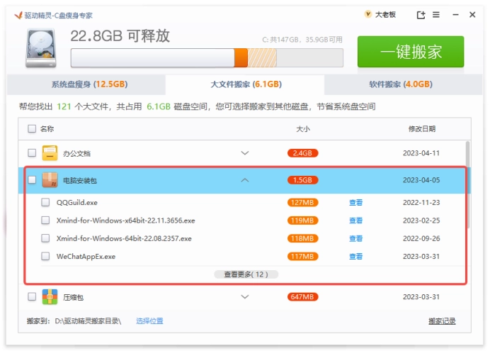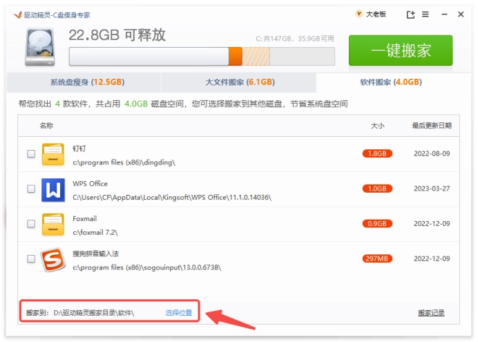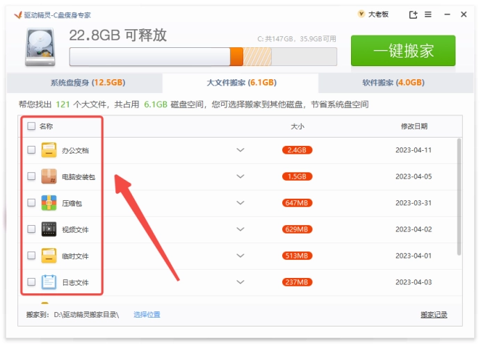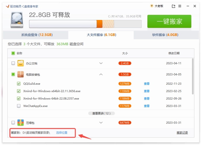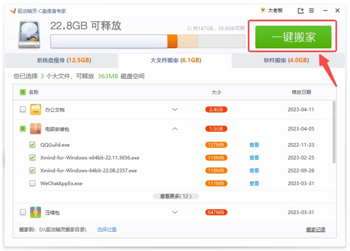 “一键搬家”,将选中大文件搬迁到新盘符;