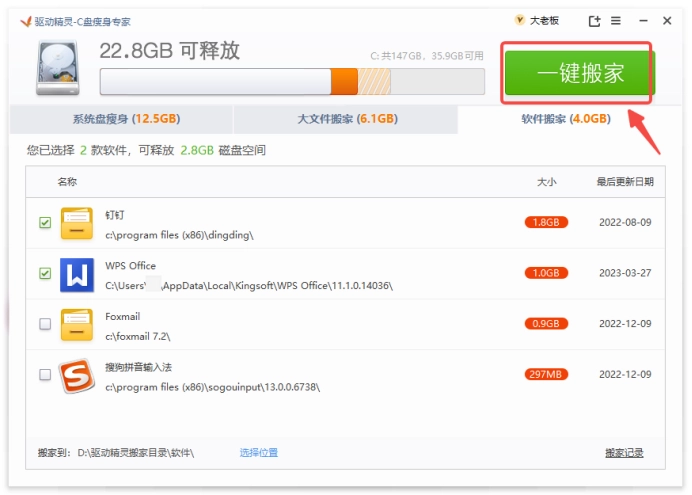 3、点击“一键搬家”,快速将选中文件从C盘搬迁到指定盘符;
