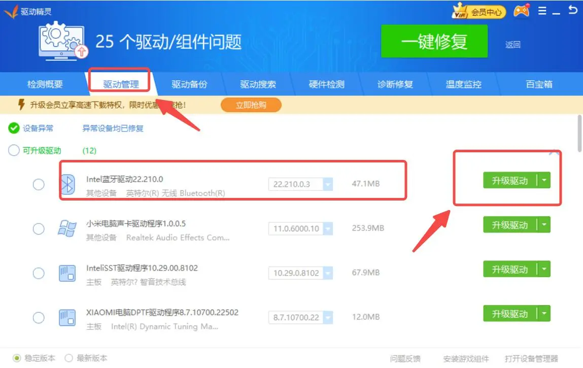 “驱动管理”扫描完成后,找到“intel蓝牙”,点击“升级驱动”;