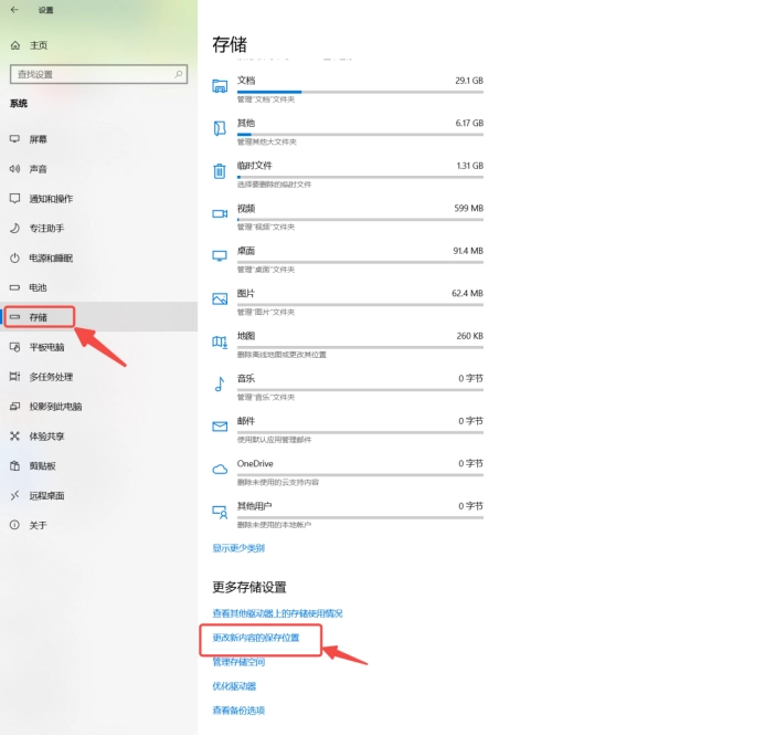 (2)找到“存储”,点击“更改新内容保存位置”;