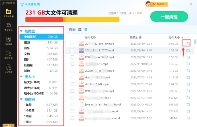 分类展示电脑中存放的大文件,可快速批量处理同类文件,点击右侧文件标识,可跳转文件存放位置。
