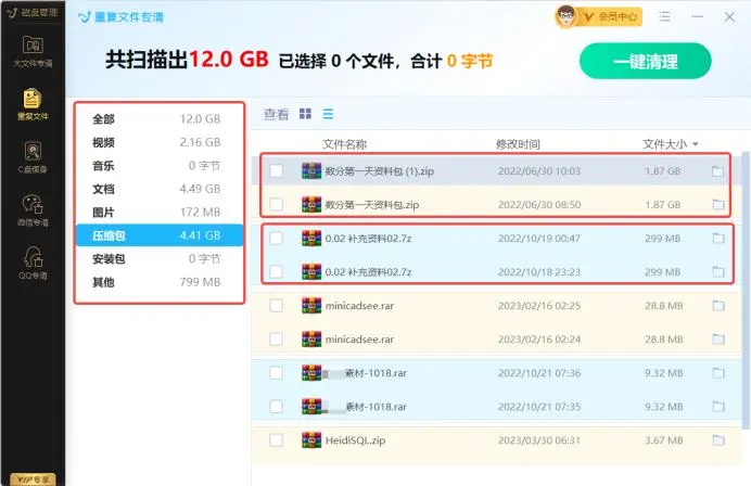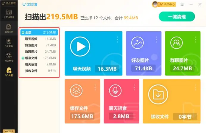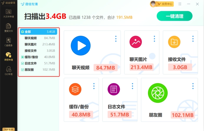 支持QQ文件清理,根据文件类型快速定位、清理;