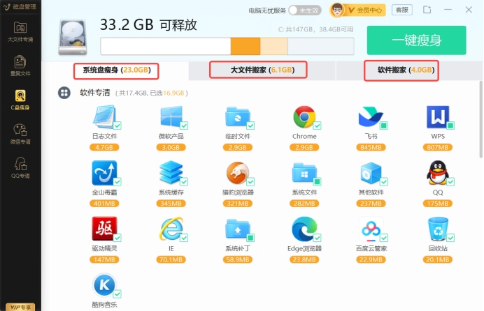 系统盘瘦身、大文件搬家、软件搬家三大功能,分门别类归纳磁盘文件,快速定位清理垃圾文件,将C盘大文件搬家到其他文件夹。