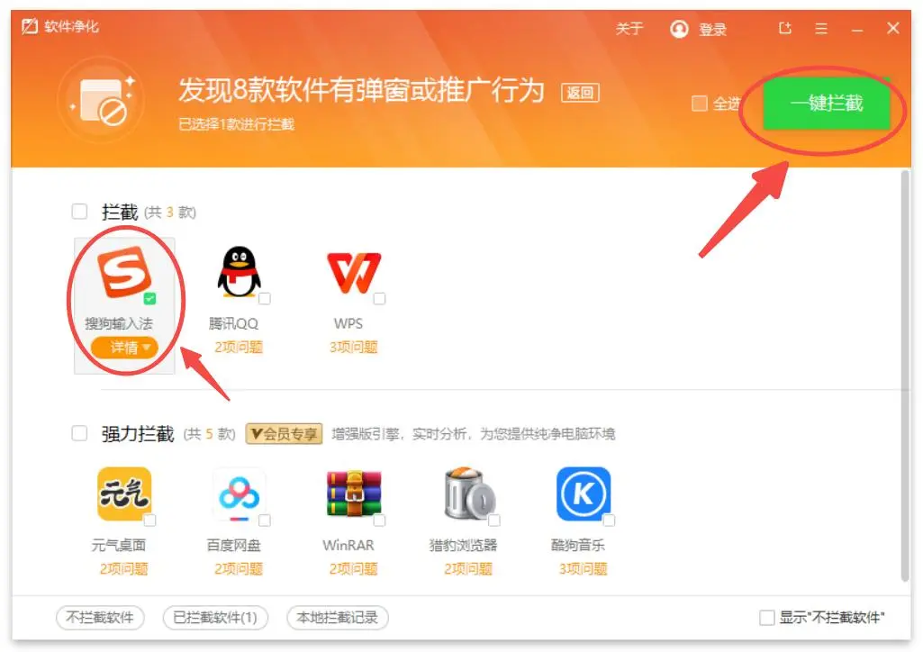 6、勾选需要拦截弹窗的软件,在点击“一键拦击”即可;
