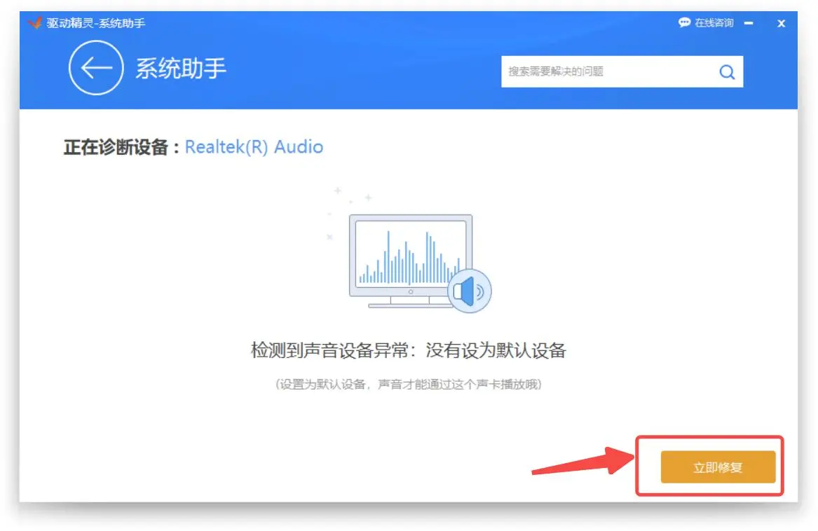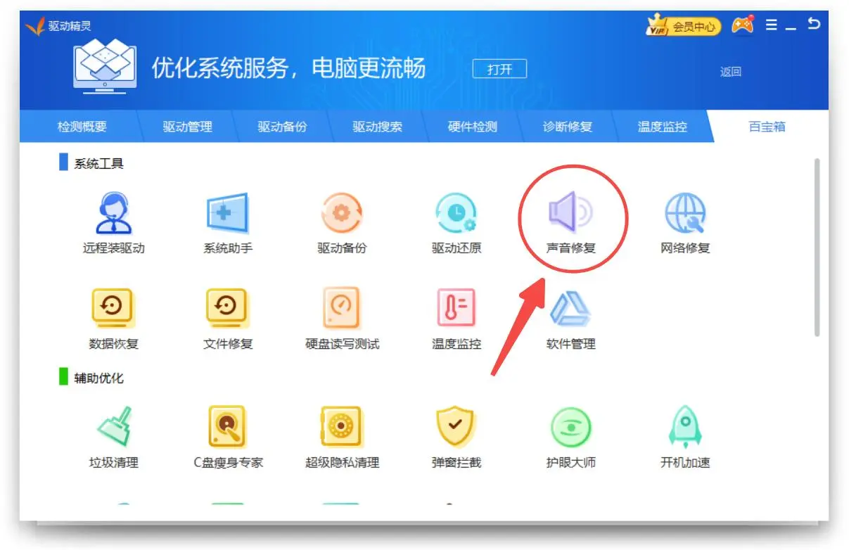电脑突然没有声音,除了软件或系统设置问题外,就是声卡出现异常,常见的有声卡驱动异常,可以使用驱动精灵的“声音修复”功能进行检测。
