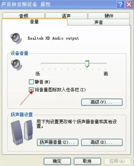 如果任务栏右侧无“小喇叭”,进入开始---设置--“控制面板--声音和音频设备”命令,打开“声音和音频设备属性”对话框,如下图: