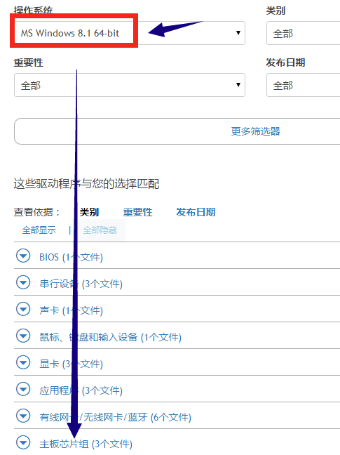 4、选择你的操作系统版本,找到主板芯片组,如下图所示
