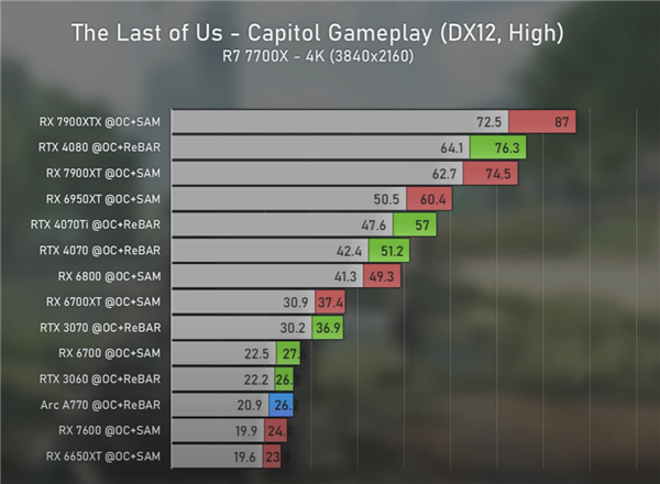 在这个游戏中,1080p及2K分辨率下,RX 7900 XTX及XT两款显卡性能在新驱动的加持下都轻松领先RTX 4080,4K下RX 7900 XT略低一点,但RX 7900 XTX依然保持领先。