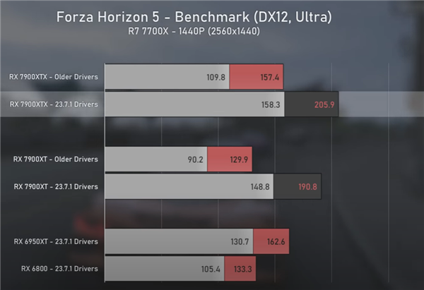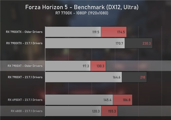 在1080p的《地平线5》中,RX 7900 XTX之前的平均帧是174.5fps,新驱动中直接提升到了230.3fps,性能提升32%,而RX 7900 XT则是130.3提升到218fps,性能猛增67%,这简直就是开挂。
