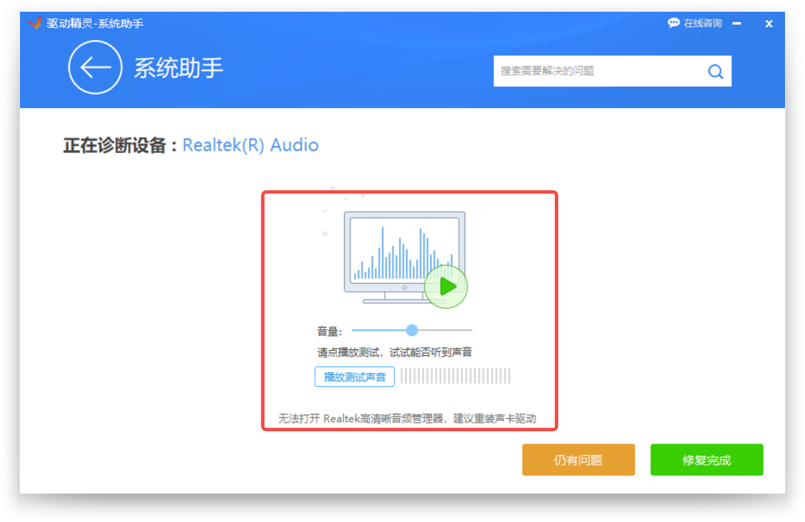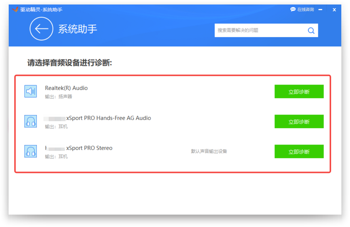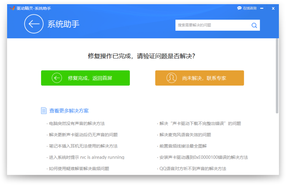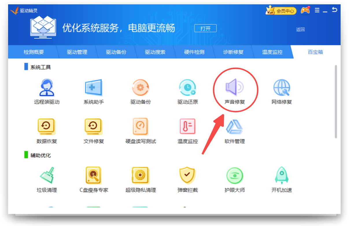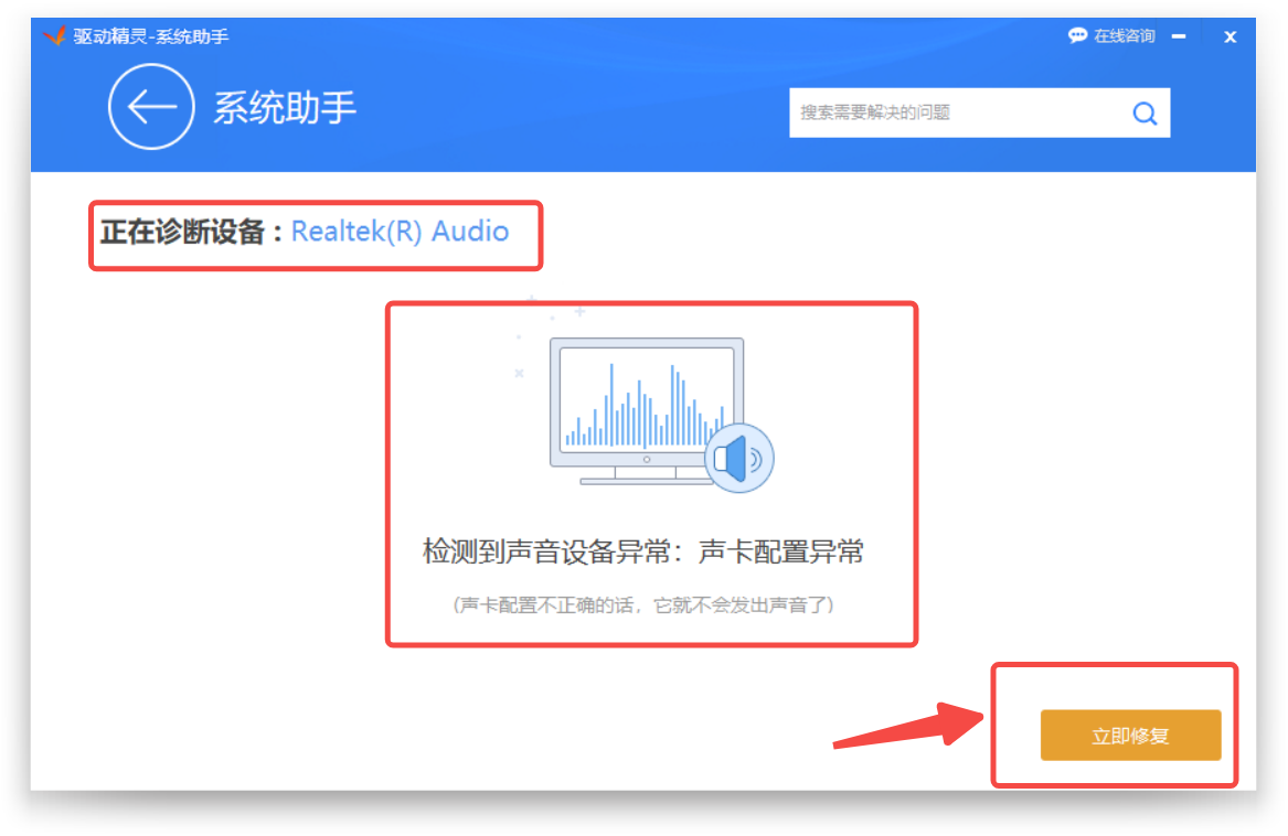 使用驱动精灵的“声音修复”工具,快速检测修复声卡问题,具体操作如下: