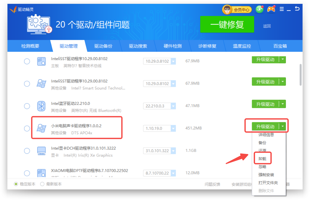 4、点击声卡驱动可以选择:卸载、升级驱动;