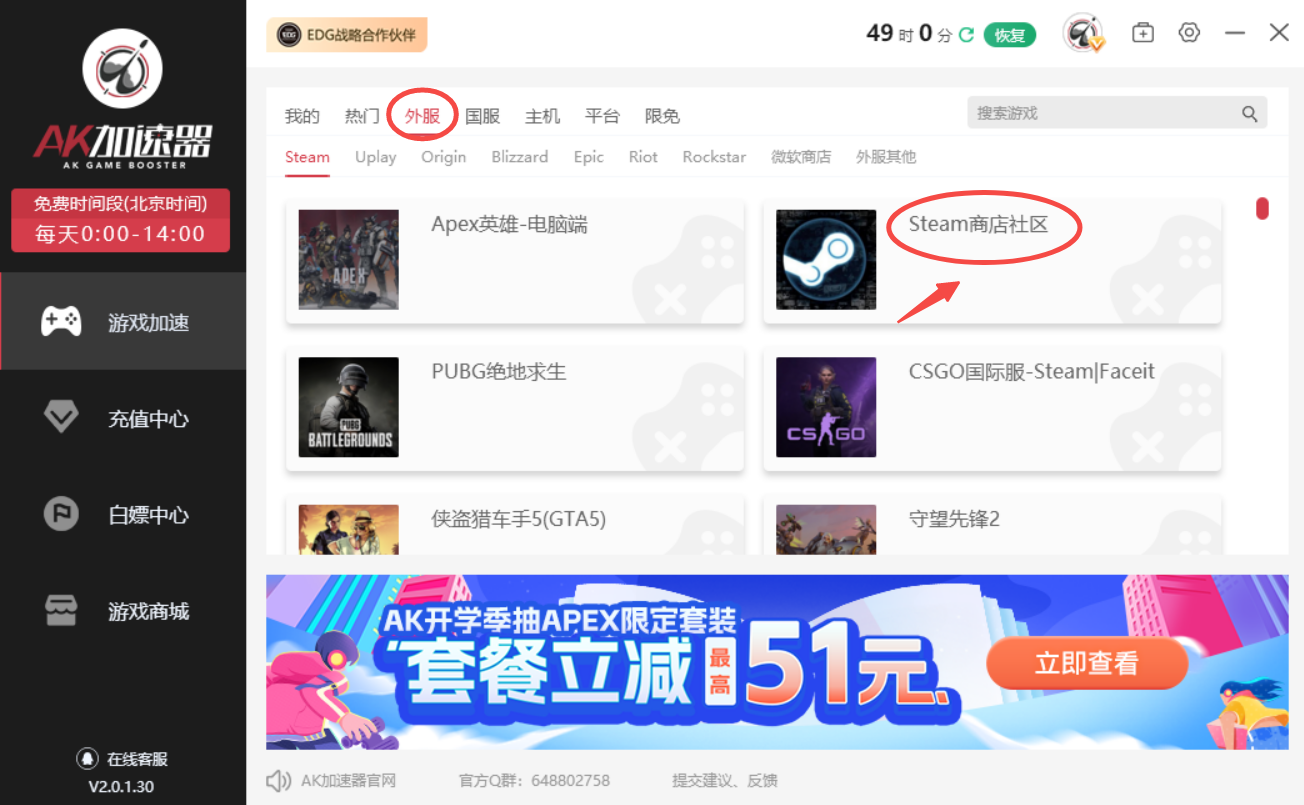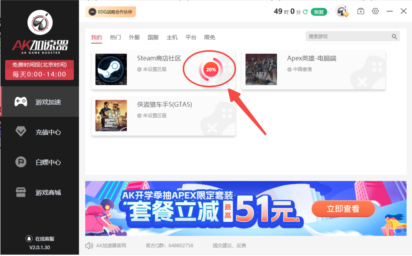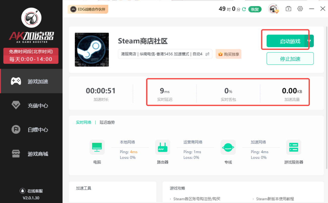 亲测有效新用户赠送48小时,外加1小时,总共49小时畅游海内游戏加速;