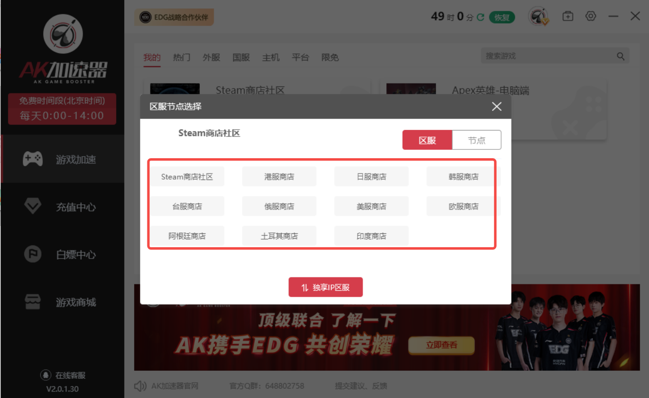 AK加速器支持境内外主流游戏加速,点击菜单栏可以自由选着;