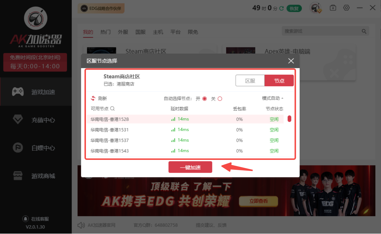 4、选着游戏所在服务区后,选在当前服务节点,根据需要查看节点延时、丢包、负荷情况,点击“一点加速”即可;