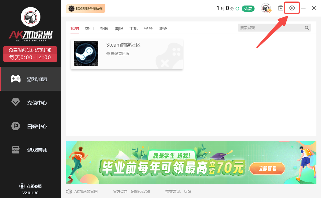 1、登陆AK加速器后,点击客户端页面右上角的“齿轮按钮”,再点击“兑换码”;