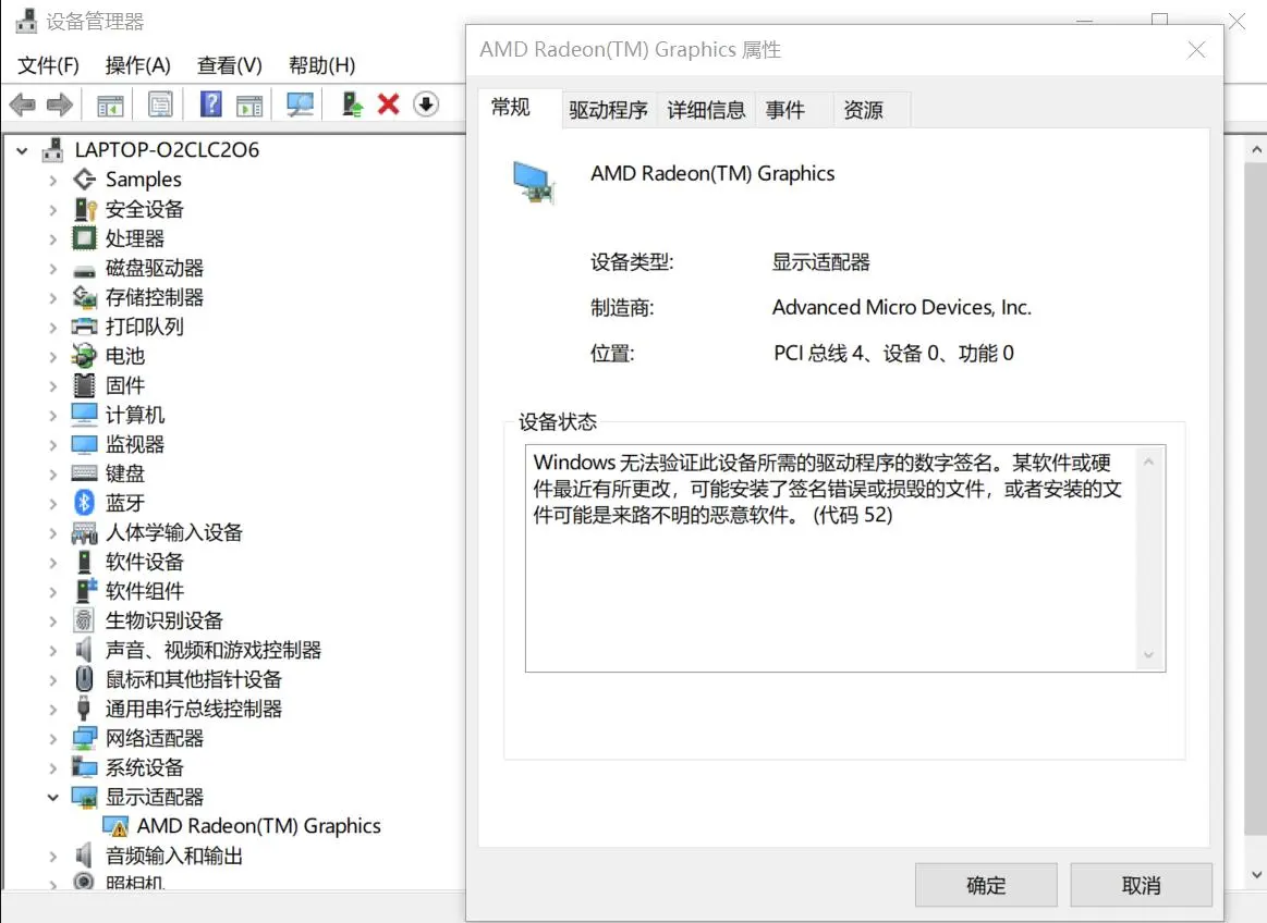 电脑管家更新显卡驱动后,设备管理器-显示适配器-AMD显卡黄标&设备状态报错代码52。