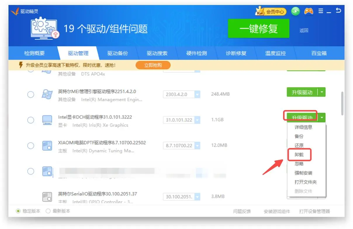 1、使用驱动精灵将当前安装的显卡驱动卸载后,在重新安装驱动程序即可,具体操作如下: