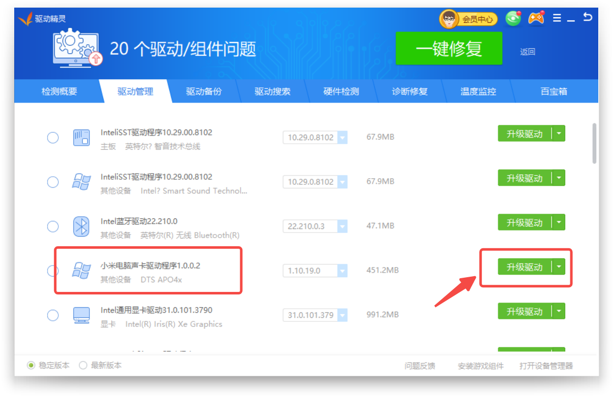 部分设备需要更新驱动程序,使用驱动精灵快速更新声卡驱动;
