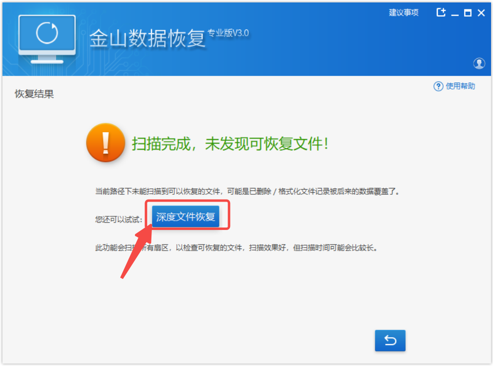 6、如果提示“未发现可恢复文件”,点击“深度文件恢复”;