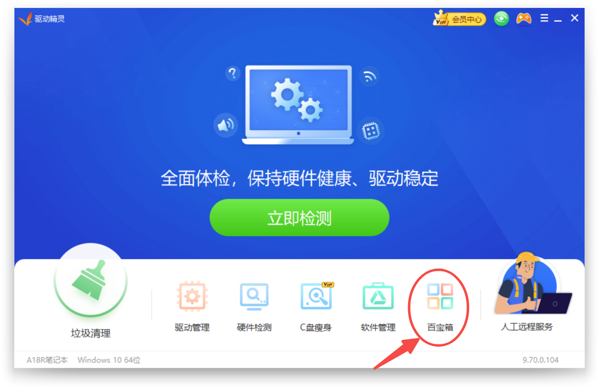 1、安装并启动驱动精灵,点击“百宝箱”功能;