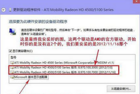 6、安装了“Microsoft基本显示适配器”后,也就算是卸载了微软的AMD驱动“ATI Mobility Radeon HD 4500 Series(MicrosoftCorporation WDDM V1.1)”,此时电脑的显示不正常,你就可以正常安装AMD的官方显卡驱动了。
