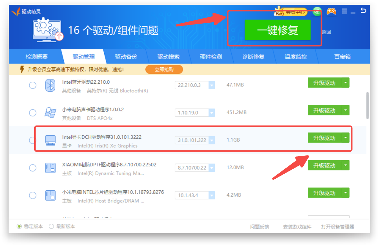 (2)等待驱动扫描完成,可以选择“一键修复”电脑硬件驱动,或单独选中升级显卡驱动;