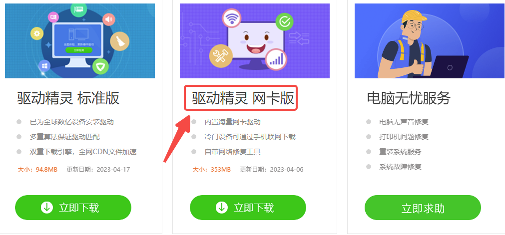 1、使用可以正常的设备,如手机、平板或其他电脑,在驱动精灵官网,下载网卡版安装包,其自带海量网卡驱动程序,支持不联网安装网卡驱动;