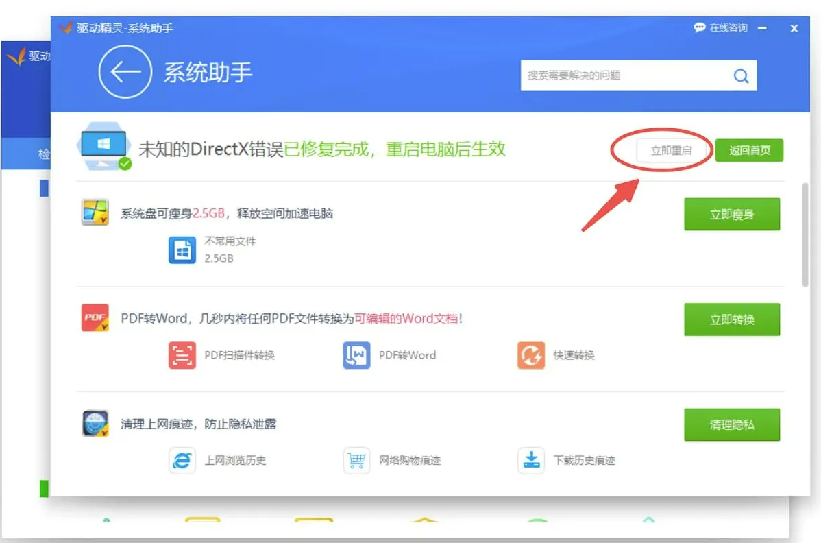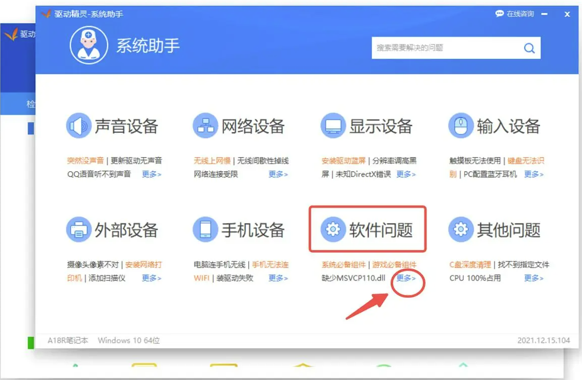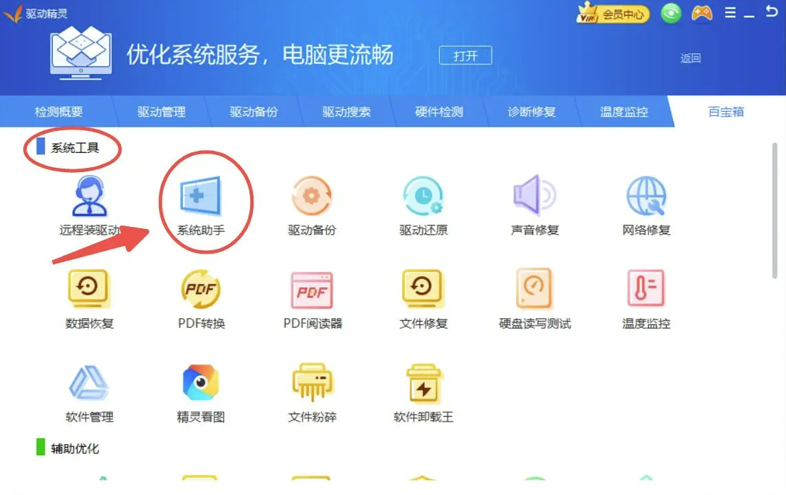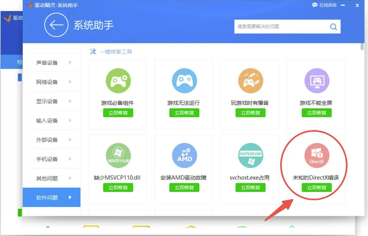 驱动精灵的系统助手中有针对此类问题的自动修复工具,具体修复操作如下: