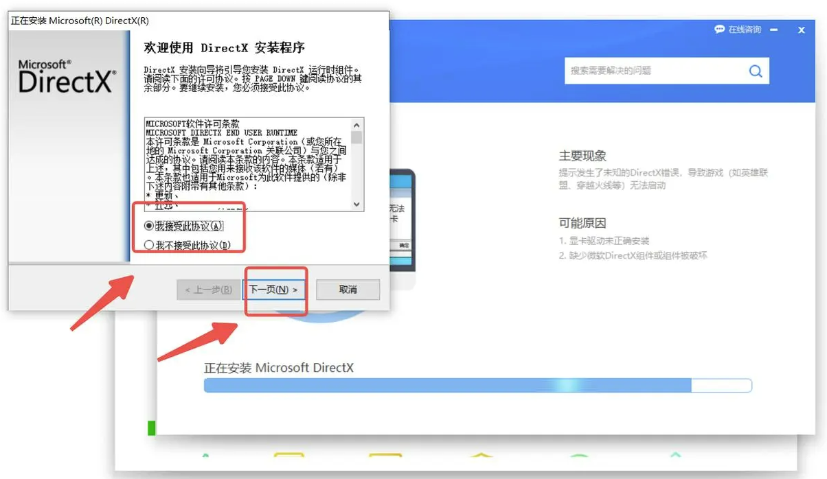 2、缺少微软DirectX组件或组件被破坏,系统调用出现异常;