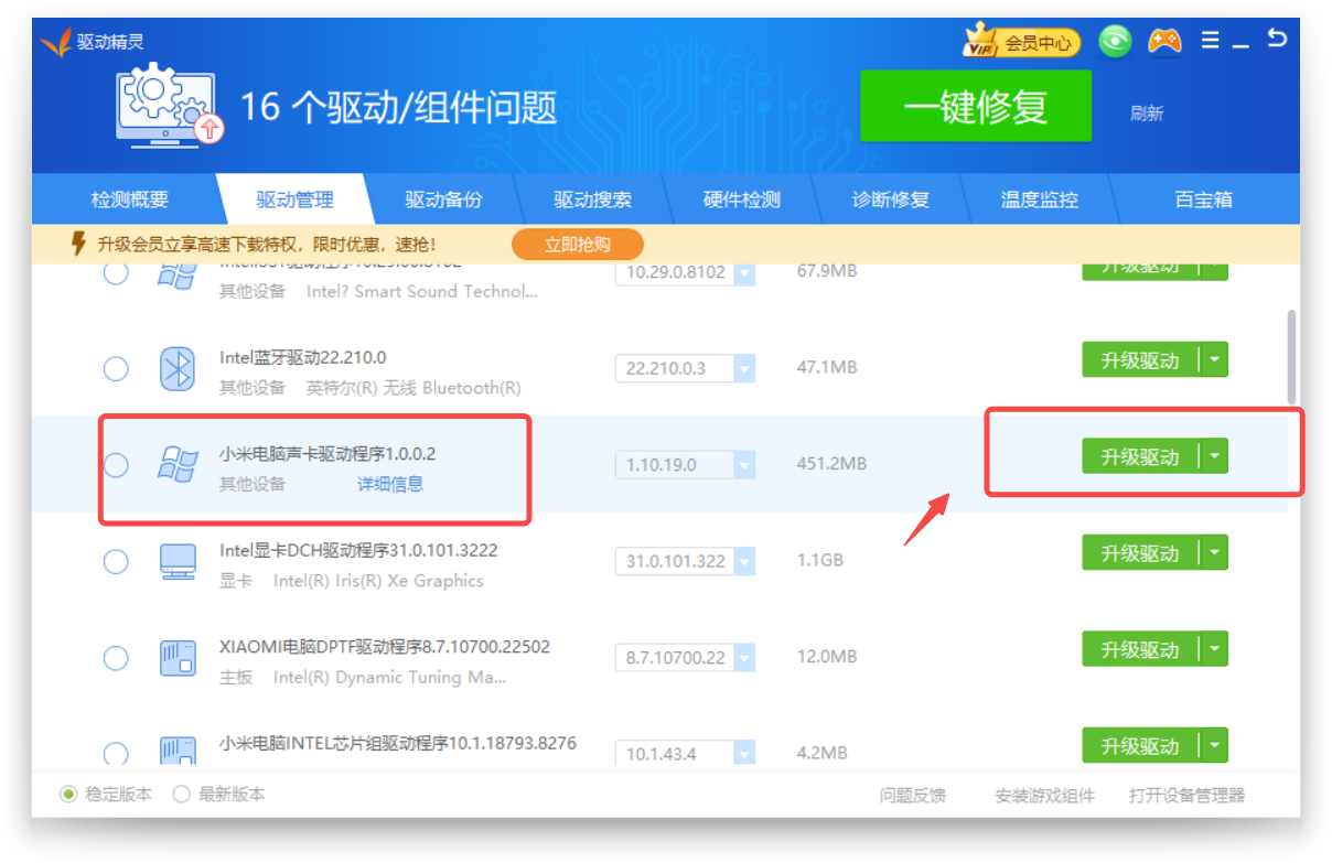 使用驱动精灵快速安装升级电脑声卡驱动;