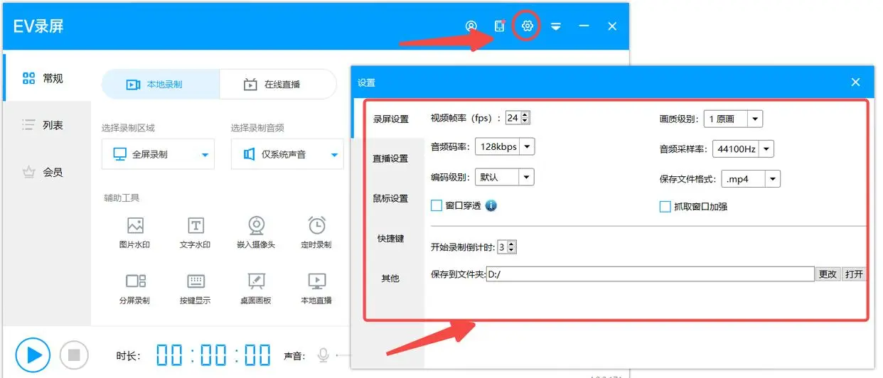 2、在主界面右上方,点击设置,可以设置录制内容参数;