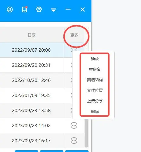 4、在更多栏中可以修稿录制视频名称、转码、上传分享等;