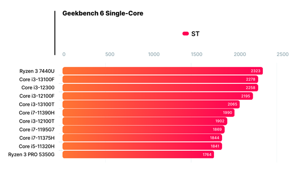 GeekBench 6实测它的单核跑分为2323,在众多四核心处理器中一直独秀,甚至超越了桌面上的i3-13100F、i3-12300。