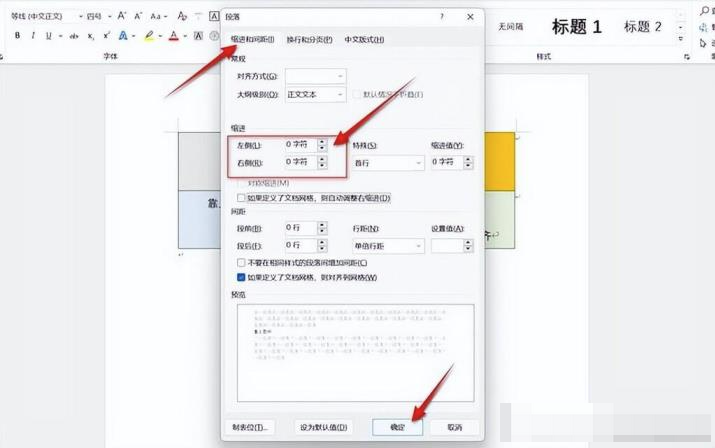 同样的我们选中word表格单元格,单击“开始”-“段落”-“缩进和间距”,将左右缩进都设置为0字符,单击“确定”即可。