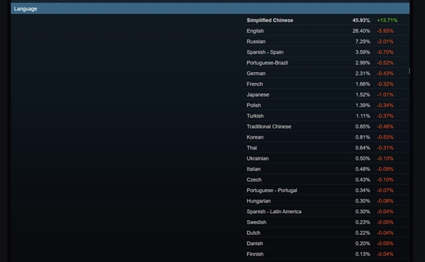 用户所使用的语言方面,10月,简体中文占比45.93%为用户最常用的语言,增长了13.71%;而英语则下降了5.93%占比仅为26.40%。