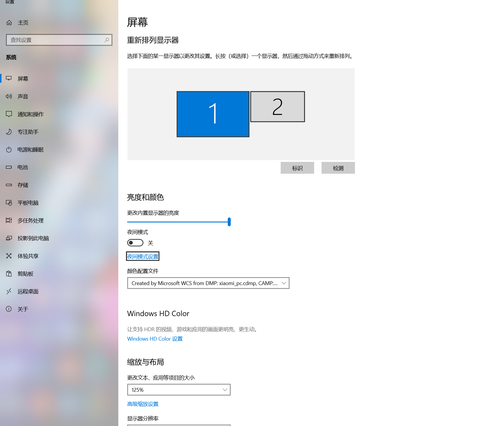 5、可以看到当前电脑连接的两个显示器,用数字“1“、”2”标识;