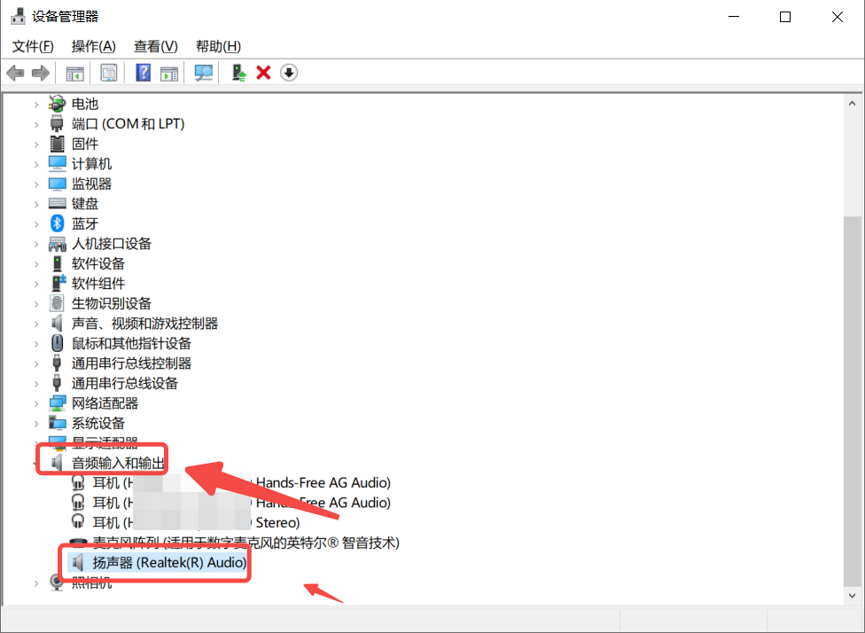 2、在“设备管理器”中的“音频输入和输出”,找到“扬声器”并双击;