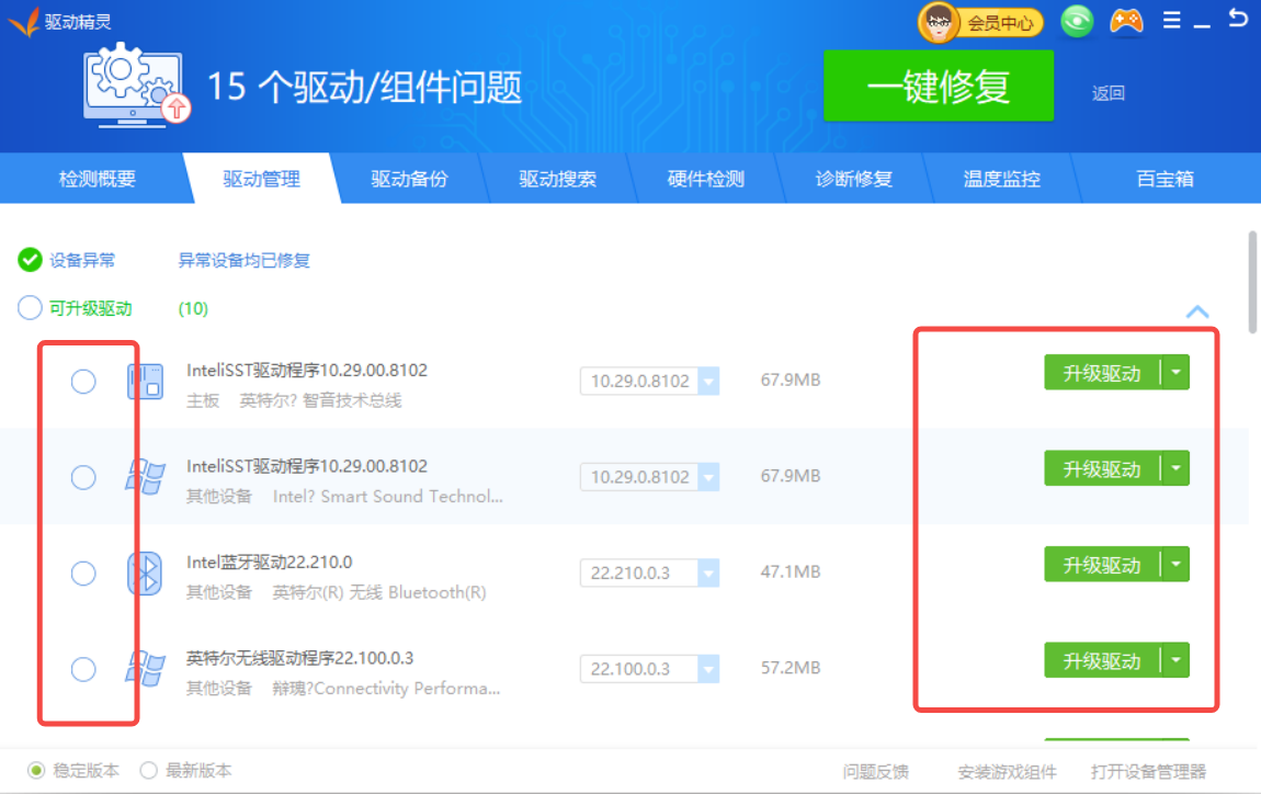 4、点击“一键修复”快速升级硬件驱动;